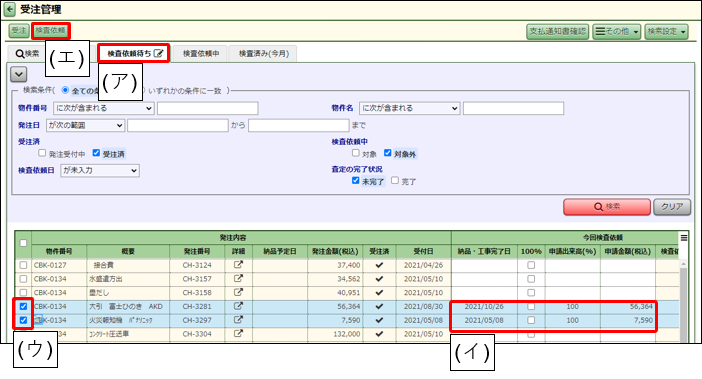 - チェックを入れて、[検査依頼]ボタンを押してください。 …(ウ)(エ)