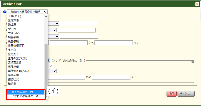 - 「–追加する検索条件を選択–」欄を選択し、追加したい検索条件を選択してください。 …(イ)(ウ)