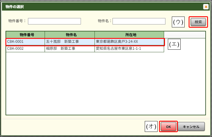 - [物件]ボタンを押して、「物件の選択」ダイアログを表示してください。 …(イ)