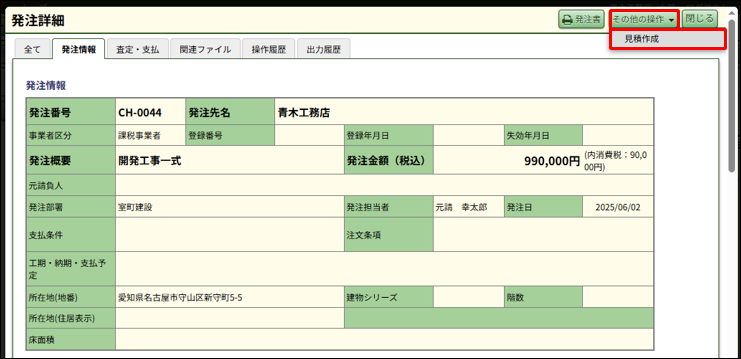 作成された見積は、選択した発注から以下の情報を引き継ぎます。