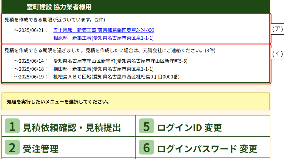 - 協力業者側で見積依頼を作成可能な物件のうち、作成可能な期限が近づいているまたは超過している物件の一覧が表示されます。 …(ア)(イ)