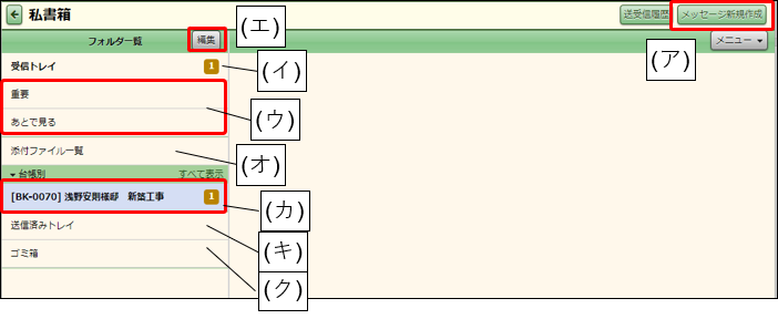 - フォルダ一覧で「受信トレイ」「ユーザーフォルダ」「工事別フォルダ」「送信済みトレイ」「ゴミ箱」をクリックすると「メッセージ参照」画面が表示されます。フォルダ一覧ボタンをクリックしてフォルダ一覧画面に戻ります。 …(ア)